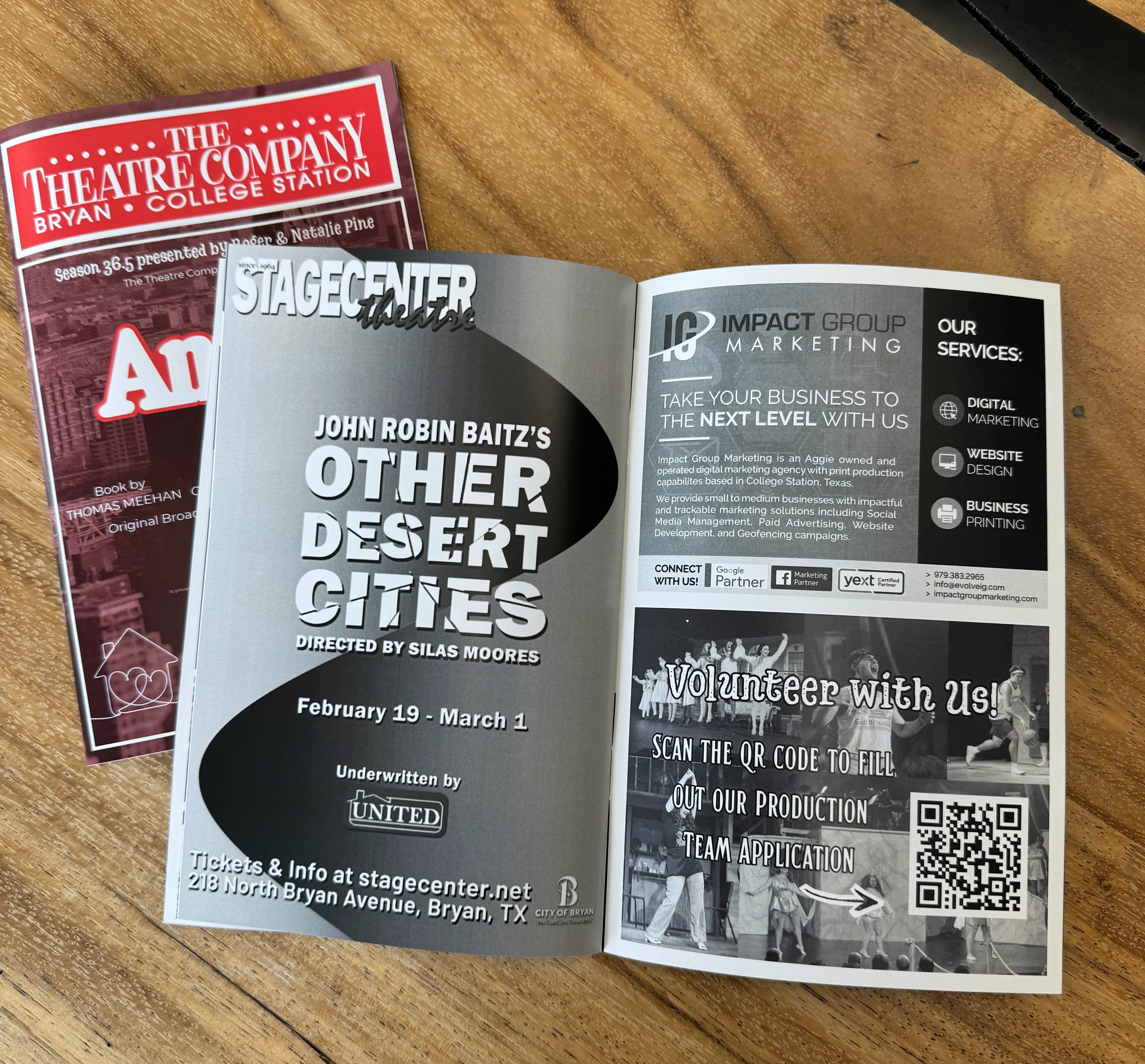 At Impact Group Marketing, we know your theatrical production is more than just a performance. It is an experience. Your playbill serves as a keepsake for your audience and a professional representation of your cast, crew, sponsors, and organization. Our theater playbill printing services are designed to deliver high-quality, polished programs that reflect the excellence of your production.